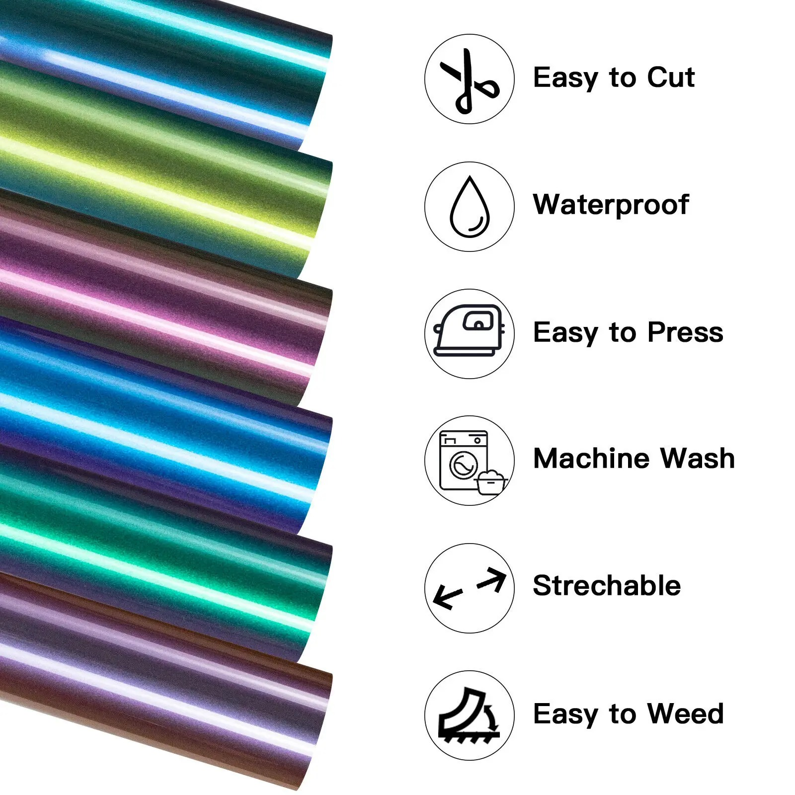 Create eye-catching designs with a colour-shift effect that changes depending on the angle and light. This 12 sheet Chameleon HTV pack includes 6 vibrant gradient colours (2 sheets of each), sized at 30.5 x 30.5 cm, ideal for bold and personalised textile projects.