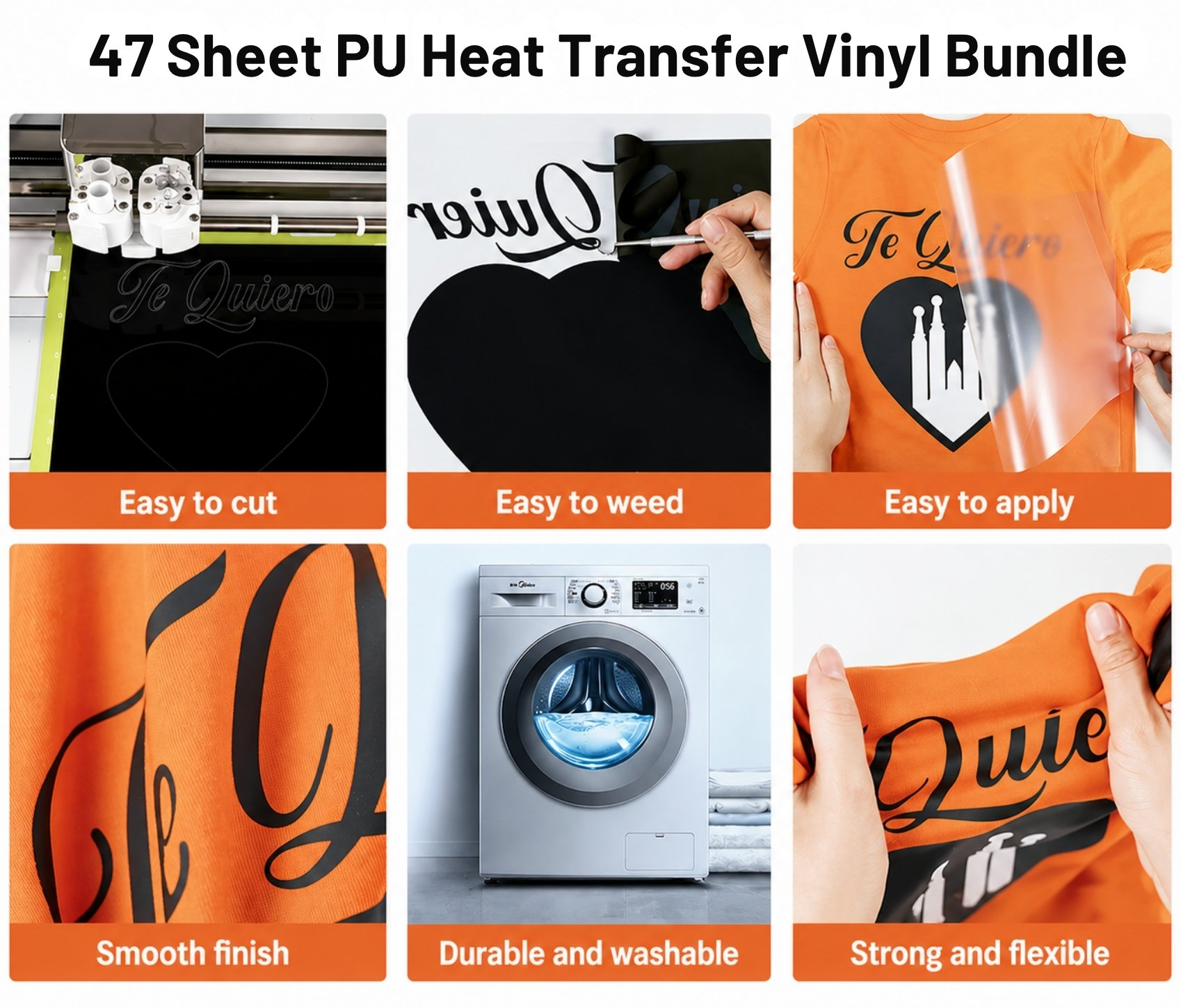 The smooth PU surface supports precise cutting and clean weeding. The vinyl responds to heat and pressure and can be applied using a heat press. After pressing, allow the design to cool before peeling.