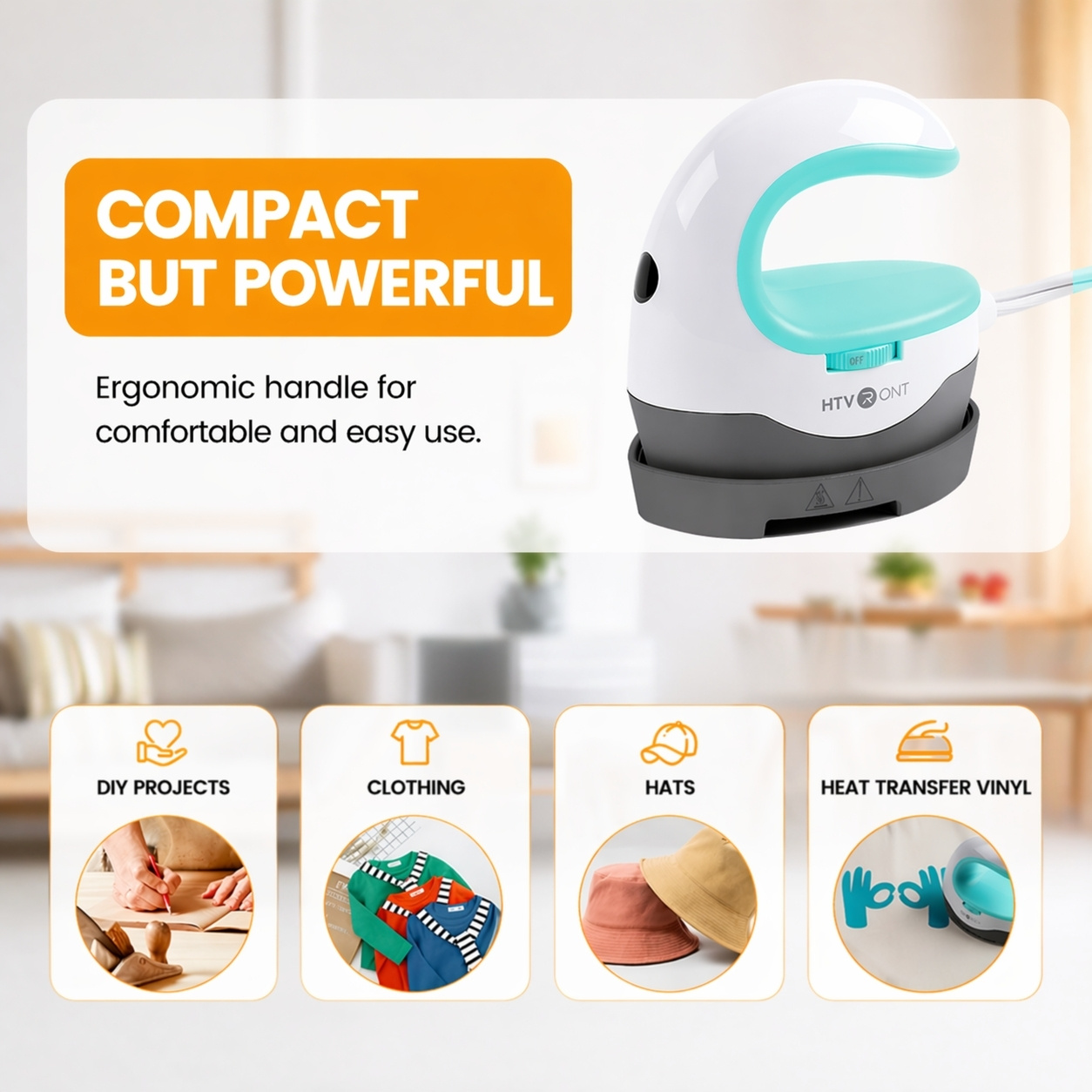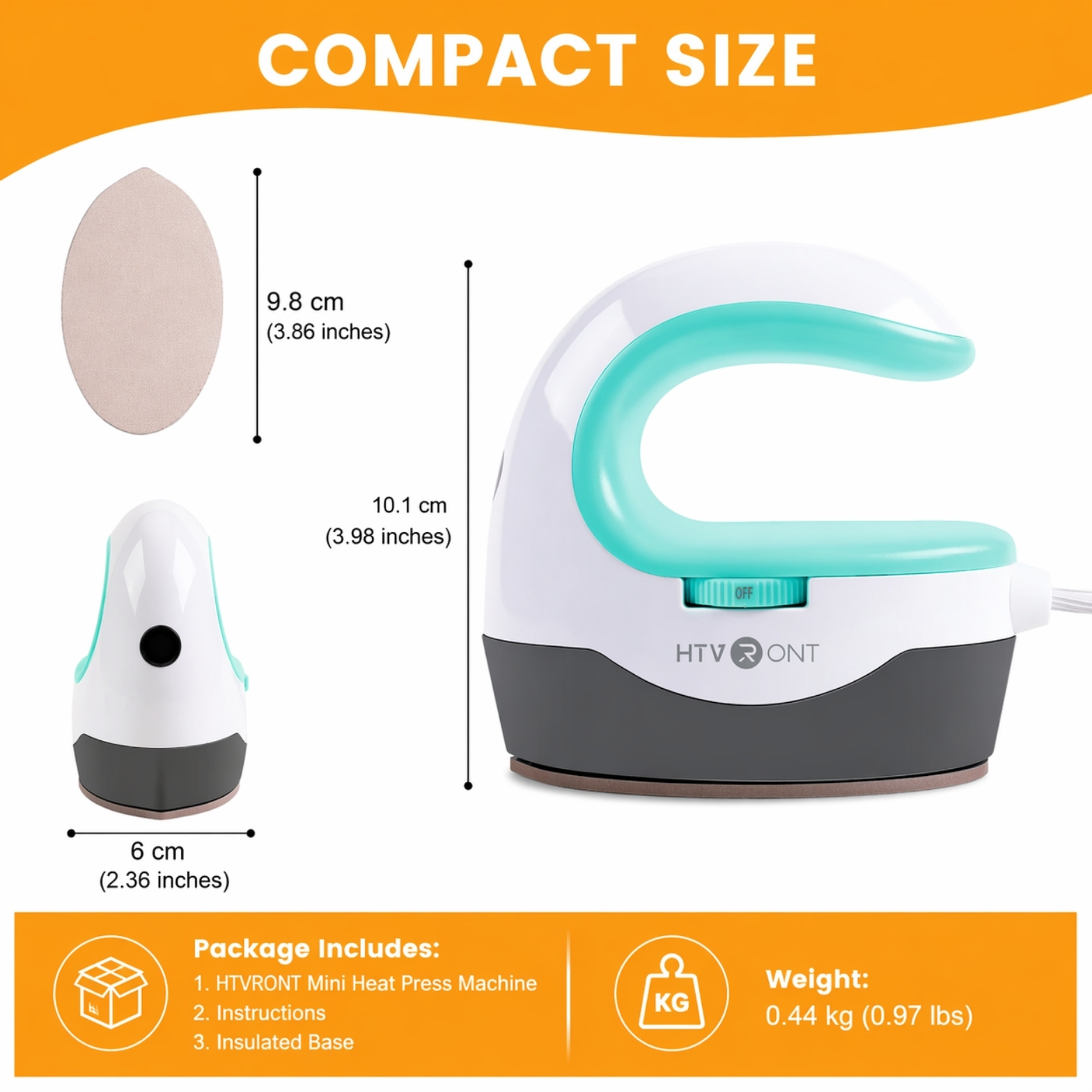 This compact mini heat press in mint green is designed for precise heat transfer on small and detailed projects. It is a practical solution for applying heat transfer vinyl and sublimation designs without using a large press. Ideal for Cricut users working on T-shirts, hats, bags and other fabric items.